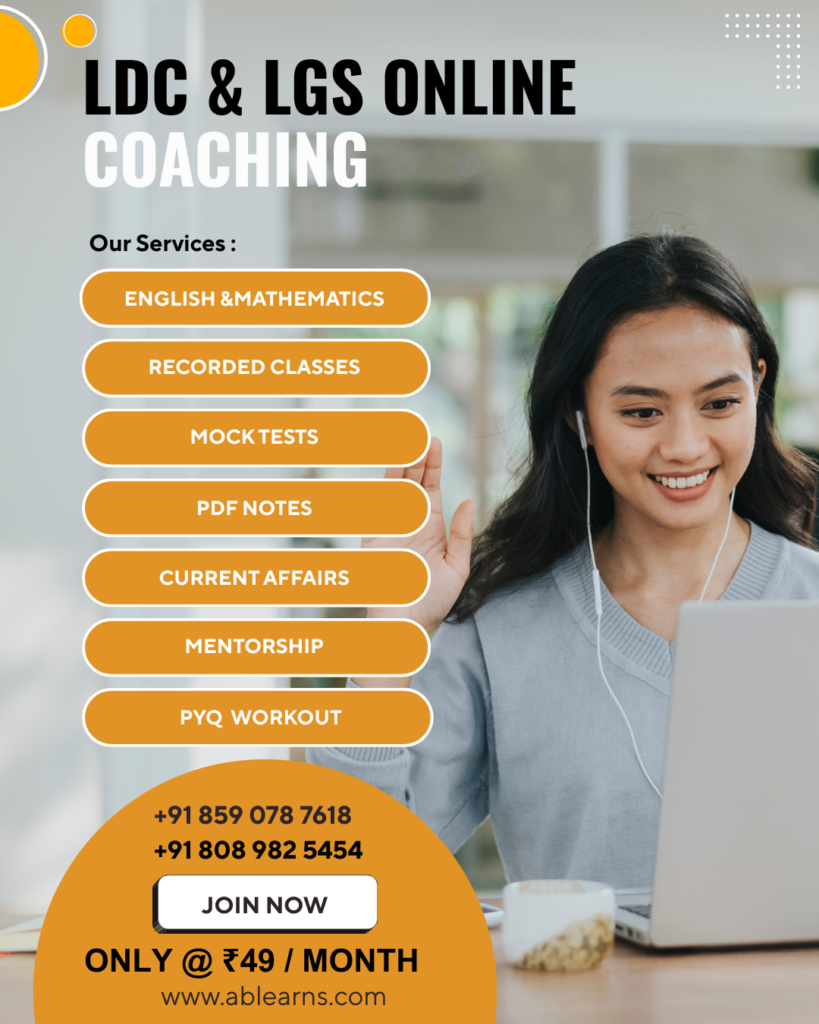 Affordable online coaching for Kerala PSC LDC & LGS exams at just ₹49 per month. Get access to high-quality video classes, regular mock tests, daily current affairs updates, downloadable PDF notes, and personal mentorship to guide you towards success. Start your preparation smartly and confidently with expert support at a very low cost.